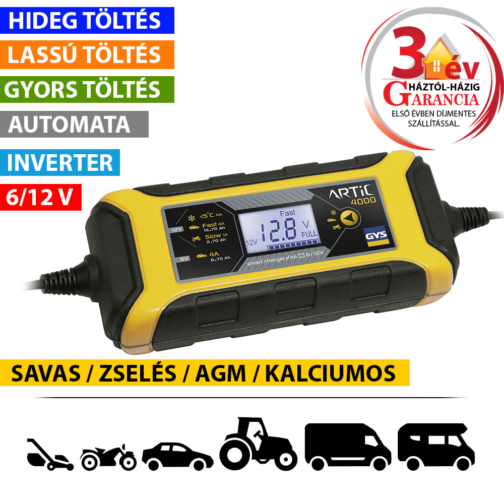 Az ARTIC 4000 akkumulátor töltő a legtöbb karbantartást igénylő vagy karbantartásmentes, ólomakkumulátor töltésére lett kifejezetten kifejlesztve, melyet autóknál és sok egyéb járműnél használnak. Ezek az akkumulátorok különböző típusúak lehetnek, pl.: ZSELÉS (zselésített elektrolitú), AGM (felitatott elektrolitú), savas, karbantartásmentes, kalciumos...